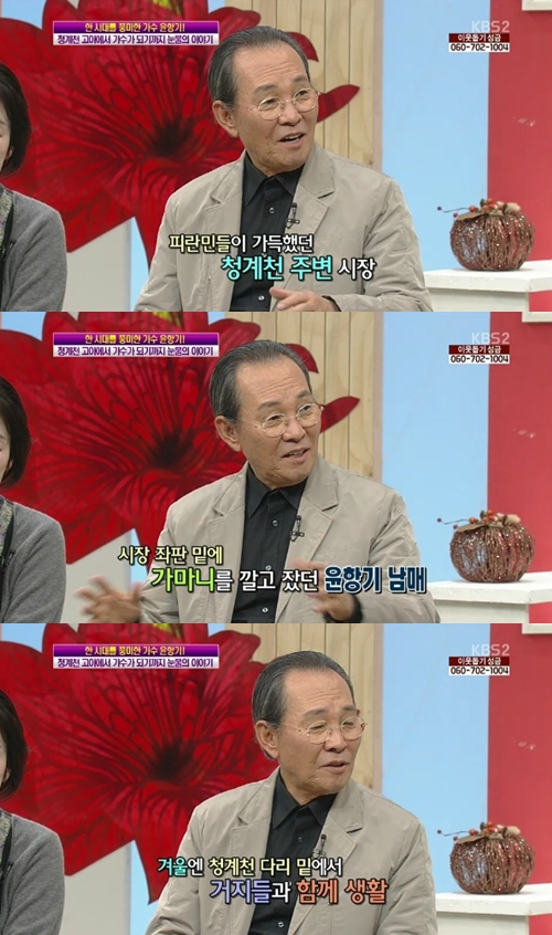 가수 겸 작곡가 윤항기가 청계천 거지 출신이라고 밝혔다. 가수 윤항기는 15일 방송된 KBS 2TV &'여유만만&'에 출연, 청계천 고아에서 한 시대를 풍미하는 가수로 성장했던 인생사를 솔직하게 털어놨다. 윤항기는 &'아버지는 방송계에서 유명한 분이셨다. 동생과 나는 공연을 다니시는 부모님을 따라 이른바 유랑생활을 했다. 그러다 내가 10살 때 갑작스럽게 어머니가 돌아가셨다. 2년 후 아버지 역시 심장마비로 세상을 떠나셨다. 동생과 나는 돈도, 갈 곳도 없었다&'고 회상했다. 어 윤항기는 &'청계천 주변 시장에서 좌판 밑에 가마니를 깔고 잤었다. 겨울이 되면 추워서 다리 밑 넝마주이들과 함께 생활했다&' 고 밝히며 &'한마디로 윤항기, 윤복희가 청계천 거지 출신이다&' 고 전했다. (사진 = KBS 2TV &'여유만만&' 캡처)