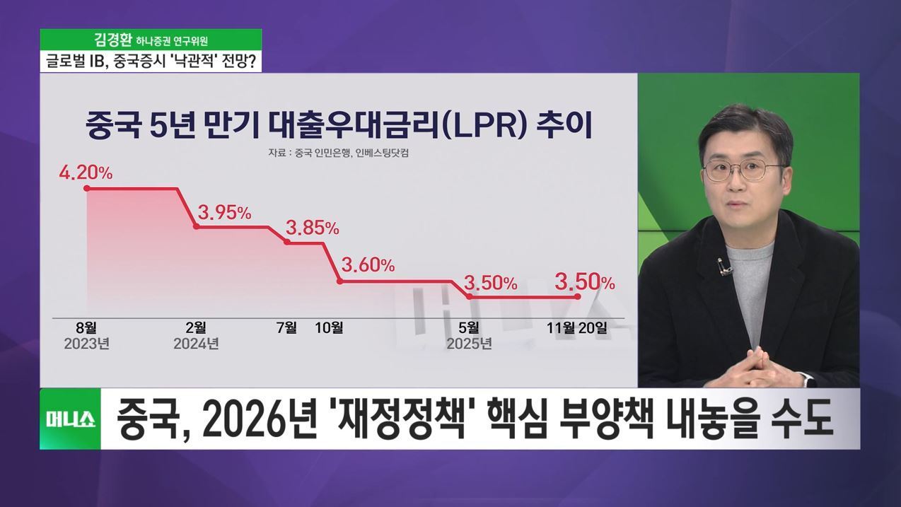 ■ 머니쇼+ &'투자 노하우&' - 김경환 하나증권 연구위원 최근 주요 글로벌 IB들이 중국증시에 대한 낙관론을 내놓고 있다고 해요. 장기적인 관점에서 투자 매력이 높다는 평이에요? 뉴욕증시나 우리 증시의 기술주도 주목하게 되지만 사실 중국 기업들의 기술 발전 속도에 비해 &'저평가&'라는 의견도 많더라고요. 머니쇼플러스에서 이 시간을 통해 중국 기업에 투자할 수 있는 관련 ETF는 몇 번 소개해드렸는데요. 오늘(25일)은 중국 증시와 앞으로 어떤 점을 주목해야 할지 알아보겠습니다. 하나증권 김경환 연구위원 모셨습니다. Q. 최근 중국 경제 상황에 대해 먼저 여쭤볼게요. 중국 인민은행이 대출우대금리(LPR)를 6개월째 유지 중입니다. 내수 부진이 여전한 상황에서 유동성 공급이 필요할 듯 하지만 신중한 모습이에요? - 글로벌 IB &'중국증시, &'26년 기업 실적 개선 기대감&' - 중국 인민은행, 대출우대금리(LPR) 6개월째 유지 - 중국 LPR 1년물 3.0%·5년물 3.5%로 유지 - 중국 &'내수 소비 진작&' 시급하지만 신중 모드로 - 중국, 연간 경제성장률 목표 5% 달성 시급해져 - LPR 1년물, 신용대출 등 일반 대출 금리 산정 기준 - LPR 5년물, 주탁담보대출 금리 산정의 기준으로 - 중국, 여전히 부동산 시장 침체로 내수 부진 지속 - 부동산 시장 활성화 위한 유동성 확대 방안 필요 Q. 중국 하면 분기 별로 &'경기 부양책&'을 기대하게 되는데요. 올해 하반기에는 별다른 조치가 없었지만 경제성장률 목표 달성을 위해 12월에 내놓을 수 있다는 기대감과, 내년 초에 내놓을 수 있다는 기대감이 공존하는 듯해요? - 하반기, 중국은 별다른 부양책 없이 LPR만 유지 - 중국, 연간 경제성장률 5% 위해 부양책 내놓을까 - 중국, 2026년 &'재정정책&' 핵심 부양책 내놓을 수도 - &'확장형 통화정책, 中 재정 확장 보조 역할&' - 2026년 3월 중국 전인대 예정…부양책 나올까 - 가계소비율 목표·서비스업 부양책 제시 가능성도 - 1분기 中 신용지표·4월 생산자물가지수에 주목 Q. 주요 글로벌 IB들은 2026년 중국 증시에 대한 긍정론을 내놓고 있다고 하는데요. 그 근거로 정부의 정책적인 지원, 기술 혁신, 자금 유입을 들었다고 하죠. 위원님이 보기에는 어떠세요? - 글로벌 IB, 중국증시에 대한 긍정론 잇따라 제시 - 中 경제 성장의 안정성·정책 환경 개선 등 낙관론 - 글로벌 IB, 中 기술혁신 가속화에도 &'긍정적 평가&' - 글로벌 IB &'중국증시, 장기 투자 매력도 높아져&' - 中 정부 정책 지원·기술 혁신·자금 유입에 주목 - 中 정부 &'과다경쟁 방지&' 정책, 증시 상승에 기여 - 반내권 정책, 리튬 등 업계 내 소모적 과다경쟁 방지 - 모건스탠리 &'반내권, 中 시장 안정적 성장 뒷받침&' - JP모건 &'中, AI 대국…글로벌 투자자 이목 집중&' - 모건스탠리 &'내년 中 A주 등 자금 유입 지속&' Q. 미국과 중국이 최근 무역전쟁 휴전 중이긴 하지만, 여전히 희토류와 반도체는 양국에 약점이자 강점이 되고 있는데요. 어제(24일) 나온 소식을 보면 중국이 19개국과 희토류 네트워크를 구축해 미국에 맞불을 놨어요? - 中, 20개국과 &'희토류 동맹&'…휴전에도 대미 견제? - 中, 美 빠진 G20서 &'녹색광물 이니셔티브&' 발표 - 中, 남아공·인니 등 19개국과 경제·무역협력 강화 - 시진핑 &'中, 녹색광물 분야서 국제협력 강화 원해&' - 美, 대중국 의존도 낮추려 한국·일본·호주와 협력 - 美 빠진 G20…中, 참가국과 공급망 압박 완화 시도 - 블룸버그 &'中, 희토류 정책 방어하며 매력 공세&' - 中 리창 총리 &'G20, 단결·협력 궤도로 돌아와야&' Q. 미국과 중국은 AI 기술 패권을 두고도 치열한 경쟁을 벌이는 중인데요. 미국에서는 엔비디아 AI칩의 대중 수출을 일부 통제한 상태고, 중국에서는 자국 기업에 지원을 아끼지 않으며 반도체 자립까지 곧 가능해질 수준이라고 하잖아요? - 美, 엔비디아 &'H200&' 대중 판매 허용 검토 중 - 한경협 &'中, 5년 뒤 한국 주력사업 다 앞지를 듯&' - 中 창신메모리(CXMT), LPDDR5X D램 공개 - CXMT, 삼성·SK·마이크론 맞대결 목표로 개발 - 고성능 D램 수요 급증…심각한 물량 부족 발생 - CXMT, 글로벌 고객사 대상 적극 영업에도 나서 - CXMT &'中, 해외 제조사 의존 낮출 대안 필요&' - CXMT 최신 D램, 삼성·SK 제품과 성능 비슷 - CXMT, &'프리미엄 D램 개발&'로 사업 전략 선회 - 양쯔메모리(YMTC), 삼성과 비슷한 수준 낸드 개발 - 中, 정부 지원 바탕 韓·日서 전문 인력 대거 영입 Q. 특히 중국, 홍콩 대표 테크 기업들의 IPO도 내년 상반기에 줄줄이 예정돼 있는데요. 유니트리, 창신메모리 등 국내 투자자분들도 주목하고 있는 기업들이 상장을 위해 준비 중이라고 하죠? - 中 휴머노이드 로봇 기업 유니트리, IPO 예심 통과 - 中 유니트리, 연내 정식 IPO 신청서 제출 계획 - 中 유니트리, 기업가치 최대 70억 달러 목표 - 엔비디아 출신이 창업한 中 무어스레드, IPO 청약 - 무어스레드, 엔비디아 부사장 출신 장젠중이 창업 - 무어스레드, GPU 생산하는 &'중국판 엔비디아&' - 무어스레드, 1.6조 원 규모 GPU 생산시설 확충 계획 - 中 대표 메모리 기업 창신메모리(CXMT) IPO 예정 - 로이터 &'창신메모리, 내년 1분기 IPO 나설 듯&' Q. 최근 글로벌 증시에 투자하는 분들이 많다 보니 중국 증시에도 관심 갖는 분들이 많으실 