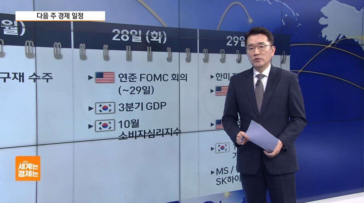 ■ 세계는 경제는 &'다음 주 경제일정&' - 김기호 앵커 다음 주 챙겨봐야 할 주요 경제일정 보시죠. 굵직한 일정들이 많은데, 월요일만 상대적으로 한산합니다. 미국 제조업체들의 지난달 내구재 수주 집계 정도만 보시면 될 것 같은데, 연방정부 셧다운 때문에 발표는 유동적입니다. 바로 화요일로 넘어갑니다. 미국 연방준비제도가 FOMC 회의를 시작합니다. 금리를 내릴 것이란 전망에 무게가 실려있죠. 특히 이번엔 셧다운으로 소비자물가 외에 데이터가 나오지 않아, 사실상 깜깜이 회의가 됐습니다. 국내에선 한국은행이 3분기 GDP 속보치를 발표합니다. 2분기엔 소비 회복과 양호한 수출 덕에 전분기 대비 0.7% 성장했죠. 성장률과 함께 이번 달 소비자심리지수도 나오는데요. 9월 지수는 6개월 만에 하락세로 돌아섰기 때문에 흐름 확인이 필요합니다. 수요일 일정 보실까요. 트럼프 미국 대통령이 경주에서 이재명 대통령과 두 번째 한미 정상회담을 엽니다. 최대 관건은 무역 협상 타결 여부인데요. 현재 핵심 쟁점에 대한 조율이 난항을 겪고 있어, 낙관적으로 보긴 어려운 상황입니다. 지켜보시죠. 미 연준은 이틀간의 회의를 마치고 기준금리를 결정합니다. 발표는 우리 시간으로 목요일 새벽 3시입니다. 현재로선 0.25% 포인트 인하가 유력한데, 앞서 전해드린 것처럼, 경제 데이터가 사실상 없기 때문에 연준 위원들의 고용시장 진단에 기댈 수밖에 없고, 그나마 나온 CPI는 큰 변수로 작용하지 않을 것 같습니다. 결과 발표 30분 뒤에 있을, 제롬 파월 연준의장의 기자회견이 주목되는 이유입니다. 미국의 지난달 상품 무역수지, 그리고 우리나라의 이번 달 기업 체감경기도 확인하시고요. 수요일은 빅테크 실적도 변수입니다. 마이크로소프트와 구글의 모회사 알파벳, 메타가 대기 중이고요. 국내에선 SK하이닉스가 성적표를 내놓습니다. SK하이닉스는 기대감이 상당히 높은데요. 영업이익 컨센서스가 11조 원이 넘습니다. 목요일로 넘어갑니다. 운명의 날이죠. 미중 정상회담이 예정돼 있습니다. 갈등을 풀기 위한 트럼프 대통령과 시진핑 주석의 물러설 수 없는 대화, 다음 주 가장 큰 이벤트입니다. 일본은행은 정책금리를 결정합니다. 최근 시장의 질문은 &'일본은행이 언제 금리를 올릴 것인가?&'에서 &'금리를 올릴 수 있을까?&'로 바뀌었는데요. 다카이치 총리가 완화적인 통화정책을 압박하고 있는 것이 변수죠. 유럽중앙은행도 정책금리를 결정하는데요. 지난 회의까지 예금금리를 2%로 2회 연속 유지했죠. 이번에도 움직이지 않을 가능성이 높습니다. 그리고 미국과 유럽의 3분기 성장률도 중요합니다. 특히 미국은 앞서 2분기 GDP가 무려 3.8%로 확정됐기 때문에 흐름이 이어졌을지가 관건입니다. 3분기 속보치, 체크하시기 바랍니다. 큰 실적 발표도 이어집니다. 애플과 아마존, 그리고 삼성전자의 3분기 확정 실적이 나옵니다. 삼성전자는 특히 반도체 성적이 관전 포인트입니다. 마지막, 금요일 일정입니다. 경주 APEC 정상회의가 개막합니다. 트럼프 대통령은 전날 떠나지만, 다자간 정상 회의에서 어떤 결과가 나올지 주목됩니다. 굵직한 지표들도 나오는데요. 지난달 우리나라의 산업활동동향과 미국의 PCE 가격지수, 중국의 이번 달 제조업과 서비스업 PMI까지 챙겨보시기 바랍니다. 빅 이벤트들도 꽉 찬, 다음주 입니다. 잘 대비해야겠습니다.