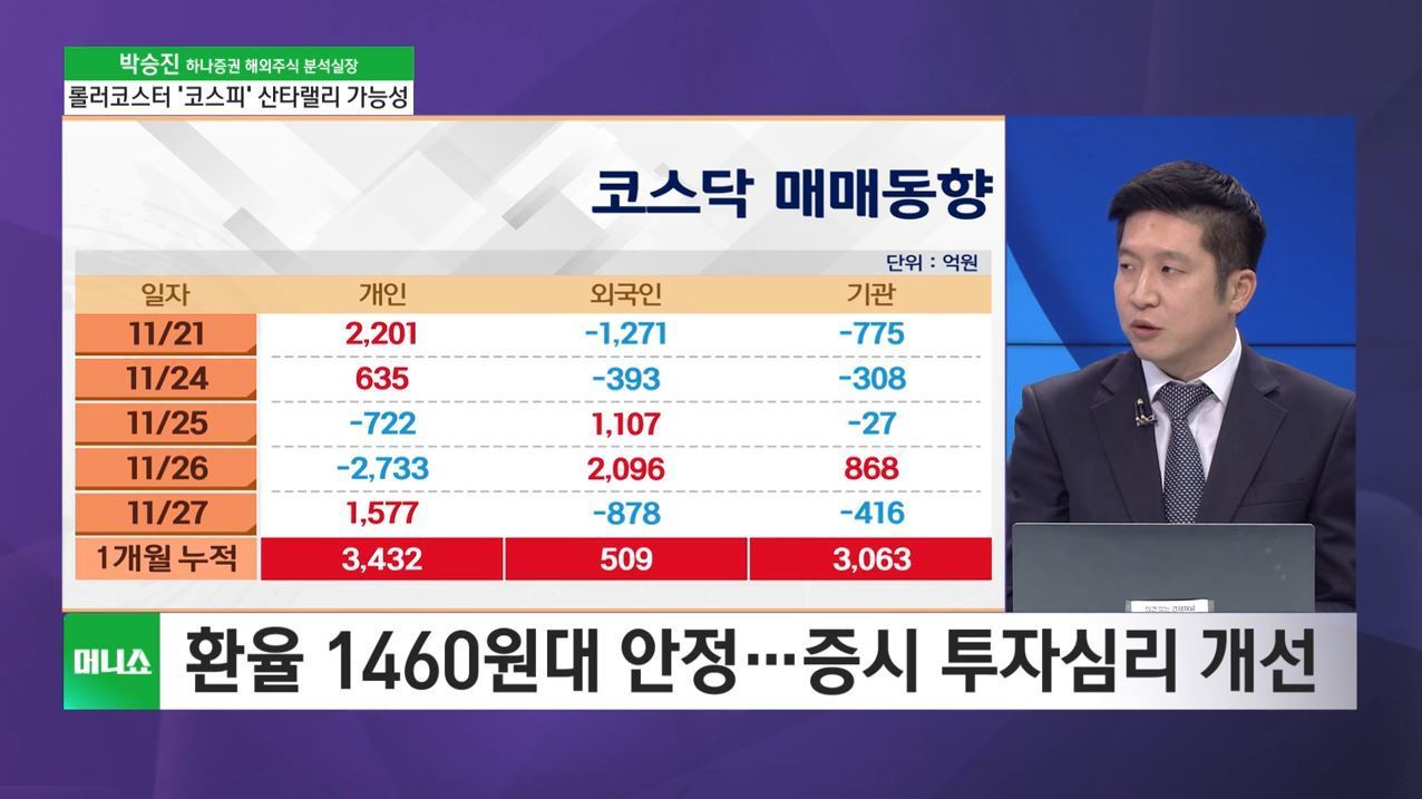 ■ 머니쇼+ &'증시 인사이트&' - 박승진 하나증권 해외주식분석실 실장 추수감사절 휴장을 앞두고 대부분의 업종이 골고루 오르며 3대 지수 모두 상승했습니다. 우리 증시는 동반 상승 출발했지만 갈수록 힘이 떨어지는 모습이었어요. 그럼 오늘(27일) &<증시 인사이트&> 출연자 모시고 자세한 이야기 나눠보겠습니다. 하나증권 해외주식분석실 박승진 실장 모셨습니다. Q. 오늘 코스피가 &'장중&' 4000선을 다시 돌파했습니다. 코스피 4000선은 심리적으로 중요한 지점인데요. 최근 변동성 확대 속에서 다시 4000을 회복했다는 점에 의미가 있을 것 같아요. 오늘 국내증시 어떻게 보셨어요? - 코스피 장중 4000선 회복…개인·기관 매수 견인 - 개인 1300억·기관 160억 순매수…외국인 매도 - 시총 상위 강세…반도체·중공업·방산 동반 상승 - 코스닥 880선 상향…개인 887억 홀로 순매수 - 코스닥 상위 종목 엇갈림…로봇·바이오 강세 - 환율 1460원대 안정…증시 투자심리 개선 - 코스피 4000선 재돌파…심리적 저항선 회복 - 외국인은 코스피·코스닥 동반 순매도 지속 Q. 오늘 새벽 누리호 4차 발사가 성공했습니다. 특히 13기 위성을 모두 목표 궤도에 올려놓았다는 점에서 &'완벽한 성공&' 평가가 나오는데요. 한화 등 민간 기업이 적극적으로 참여하면서 산업적 파급력도 커질 전망이라고 하는데… 증시엔 어떤 영향 있을까요? - 누리호 4차 발사 성공…위성 13기 전원 궤도 안착 - &'독자 우주 수송 능력 입증&'…한국 우주 기술 도약 - 센터장 &'민관 공동 발사 첫 사례…우주 생태계 전환점&' - 한화 참여한 민간 제작·조립…우주 산업 민간주도 속도 - 차세대중형위성 3호, 1시 55분 남극 세종기지 첫 교신 - 엔진 성능 설계값 상회…전체 비행 빠르게 진행 - 큐브위성 12기 모두 분리…다중 위성 발사 &'완벽 성공&' - 발사 18분 지연됐지만…발사 시한 1분 남기고 이륙 - 정부 &'달·심우주 탐사로 세계 5대 우주강국 도약&' - 한국형 발사체 지속 개발…차세대 발사체 추진 박차 Q. 구글이 &'제미나이 3.0 훈련 과정에서 GPU를 쓰지 않았다&'라고 밝히면서 글로벌 시장은 떠들썩합니다. 그런데 이런 구글의 독자칩 전략이 한국 기업에는 기회가 되고 있다고요? GPU든 TPU든 &'HBM&'은 필수라서 메모리 기업의 가격 협상력을 높여준다고 하더라고요? - 구글 TPU 부상…&'GPU 무용론&' 확대에 업계 논쟁 가열 - 제미나이 3.0 성공에도 &'GPU 생태계 여전히 견고&' - 피지컬 AI 시대 도래…엔비디아 &'자물쇠 효과&' 부각 - 구글도 TPU·GPU 병행…AI 인프라 하이브리드 전략 - 오픈AI·메타는 여전히 GPU 의존…확대해석 경계론↑ - 구글 HBM 공급망 재편…SK 60%·삼성 33% 점유 전망 - 삼성전자, 구글 효과로 HBM·파운드리 수혜 기대감↑ - 엔비디아 독점 견제…메모리 기업 협상력 강화 조짐 - TPU든 GPU든 고성능 메모리 필수…HBM 수요 급증 - 구글 독자 노선 강화…국내 반도체 새 기회 열릴까 - TPU도 HBM 필수…국내 메모리 업계 수혜 전망 - HBM3·HBM3E 탑재…구글향 HBM 수요 급증 가능성 - 삼성전자, 브로드컴·TPU 공급망 점유율 1위 - 차세대 TPU에 HBM4 탑재…삼성 경쟁력 부각 - 메타도 TPU 도입 검토…AI 인프라 판도 흔들린다 - GPU·TPU·CPU 혼용…데이터센터 메모리 구조 변화 - 엔비디아 &'우린 한 세대 앞서 있다&' 방어 전선 강화 - HBM·DDR5·GDDR7 수요 확대…국내 D램 업체 기대↑ Q. 이달 초 62만 원이던 SK하이닉스 주가가 아직은 60만원 대는 회복을 못하고 있어요? 구글이 엔비디아 GPU 대신 자체 TPU로 학습한 제미나이3를 공개하면서 SK하이닉스도 단기 충격을 받았었는데… SK하이닉스는 앞으로 어떻게 포트에 가져가야 할까요? - SK하이닉스 한 달 새 15%↓…AI 버블 논란 여파 - 구글 TPU 공개 여진…&'50만닉스&' 붕괴론 대두 - SK하닉, 엔비디아 의존도 27%…고객사 리스크 부각 - 개미 절반 손실…고점 매수 FOMO 심리 드러나 - 주가 급락 주간에도 개인 2조 순매수 &'불꽃 매수&' - 증권가 목표가 87만 원 유지…HBM 수요 견조 - TPU도 HBM 사용…하이닉스 새 수요처 가능성 - &'과도한 우려 불필요&'…메모리 공급·수요 구조 강세 - AI 칩 다변화 속 HBM 핵심성 부각…국내 수혜 기대 - 단기 흔들려도 중기 우상향 전망…핵심은 HBM 경쟁력 Q. 네이버파이낸셜과 두나무가 합병을 공식화했습니다. 간편 결제 1위와 가상자산 1위가 손잡은 건데… 업계는 &'20조 원 핀테크 거대 기업 탄생&'으로 주목하고 있어요? 그런데 검색·쇼핑에 이어 가상자산 기반의 신사업 확장…기회이기도 하고 리스크일 수도 있지 않을까요? - 네이버- 두나무 합병 공식화…20조 메가핀테크 탄생 - 주식교환 1:2.54…두나무, 네이버파이낸셜 자회사로 - 두 기업 가치 4.9조·15.1조…합병 비율 확정 - 원화 스테이블코인 추진…글로벌 결제 플랫폼 목표 - 간편 결제 1위+가상자산 1위 &'초대형 금융 생태계&' - AI 에이전트 결제 대비…디지털 화폐 기반 확대 - 금융당국, 결제·가상자산 결합 리스크 면밀 점검 - 공정위, 시장 지배력 강화 여부 기업결합 심사 - 네이버 3400만 이용자+업비트 기술력 시너지 기대 - 주총·규제 심사 남아…합병 성사까지 변수 다수 Q. 한국은행이 기준금리를 네 번째로 연속 유지했습니다. 지난달 연준이 금리를 내리면서 한·