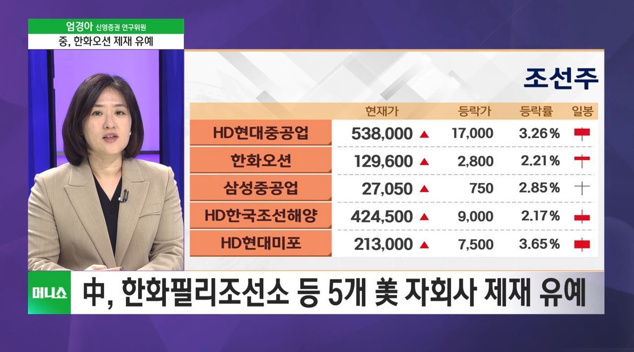 ■ 머니쇼+ &'머니줌인&' - 엄경아 신영증권 리서치센터 연구위원 요즘 조선업계 분위기, 정말 뜨겁죠. 최근 한미 정상회담에서 트럼프 대통령이 &'한국의 핵추진 잠수함 건조를 허용하겠다&'라고 말하면서, 조선업계가 다시 한번 요동치고 있어요? 이제 조선업은 단순히 배를 만드는 산업이 아니라, 국가 안보와 기술 패권이 걸린 경쟁이 된 거 같아요. 지금 조선업은 안보와 외교의 중심축이라고 해도 과언이 아닌데요. 오늘(10일)은 그 이면의 기회와 리스크를 함께 분석해 보겠습니다. 엄경아 신영증권 리서치센터 연구위원님 모시고 자세한 이야기 나눠보겠습니다. Q. 한 시간 전쯤 보도된 따끈따한 기사죠. 중국이 한화오션의 미국 자회사 제재를 1년간 유예하기로 했습니다? 한화오션은 미국 내 조선·물류 네트워크를 보유한 몇 안 되는 한국 기업인데요…이번 합의로 한국 조선업계에 어떤 긍정적인 신호가 될까요? - 미중 정상 &'확전 자제 합의&'…조선 제재 1년 유예 - 중국, 한화오션 미국 자회사 제재 1년간 중단 - 한화필리조선소 등 5개 美 자회사 제재 유예 - 미중 무역전쟁 완화…조선업 숨통 트이나 - 중국 상무부 &'301조 조사 조치 1년 유예&' 발표 - 한화오션 제재 완화…미중 협력 신호탄? - 미중 무역합의, 조선업 &'안도 랠리&' 불붙을까 - 한화오션, 美 자회사 제재 유예로 &'숨통&' - 조선업계 &'한미중 3국 협력 기회 될 것&' - 미중 갈등 완화…조선·물류·해운 수혜 기대 - 미중 정상 &'확전 자제 합의&'…조선 제재 1년 유예 - 중국, 한화오션 미국 자회사 제재 1년간 중단 - 한화필리조선소 등 5개 美 자회사 제재 유예 - 미중 무역전쟁 완화…조선업 숨통 트이나 - 중국 상무부 &'301조 조사 조치 1년 유예&' 발표 - 한화오션 제재 완화…미중 협력 신호탄? - 미중 무역합의, 조선업 &'안도 랠리&' 불붙을까 - 한화오션, 美 자회사 제재 유예로 &'숨통&' - 조선업계 &'한미중 3국 협력 기회 될 것&' - 미중 갈등 완화…조선·물류·해운 수혜 기대 Q. 엄경아 연구원님의 최근 인터뷰를 보니까, &'조선업은 이미 슈퍼사이클에 진입했다&'라고 분석하시면서 &'구조조정이 거의 완성되고 경쟁자마저 사라졌다&'라고 하시더라고요. 경쟁자가 사라졌다는 게 어떤 말인가요? - 전 세계 선박 80%…이젠 &'한중 양강&'의 시대 도래 - 일본 존재감 희미…조선업은 한중 양국 경쟁구도 - 조선 빅2, 한국·중국이 전세계 시장 80% 점유 - 한중이 주도하는 글로벌 조선업 패권 경쟁 가열 - &'조선 강국&' 일본 퇴장…세계는 한중 대결 구도로 - &'조선업, 장기 불황 끝내고 슈퍼사이클 진입&' - &'구조조정 완성·경쟁자 소멸&'…재편된 조선시장 - 일본 탈조선 정책 여파…한중 양강 체제 굳어져 - 수에즈 사태 이후 운임 5배↑…선박 수요 폭발 - 조선소 감소로 공급 격차 확대…슈퍼사이클 근거 - &'신조선가 아직 낮지만 수요는 견조한 구조&' - IMO 2050 탄소중립 목표…친환경 교체 수요↑ - &'에너지 전환 선박 2.5%뿐&'…교체시장 무궁무진 - 美 &'MASGA&' 본격화 시 연 수백억달러 시장 열린다 - &'국장 투자자, 조선업 관심 가질 만한 시점&' - &'조선업, 이미 슈퍼사이클 진입&'…장기 성장 국면 - &'경쟁자 사라진 과점 시장&'…韓·中 양강 체제 확립 - 구조조정 이후 조선시장, 대형사 중심 재편 가속 - 수에즈 사태 이후 운임 5배↑…교체·증설 수요 급증 - 조선소 수 줄며 공급 격차 확대…&'슈퍼사이클&' 지속 - IMO 2050 넷제로 목표…친환경 교체 수요 폭발 예고 - 에너지 전환 완료 선박, 전 세계 2.5%뿐 - 美 MASGA 본격화 시 연 수백억달러 시장 열린다 - &'조선산업, 경기산업 넘어 안보산업으로 진화 중&' - &'국장 투자자라면 조선업 관심 가질 시점&' Q. 현재 한국과 중국이 전 세계 조선시장을 양분하고 있다고 하죠. 두 나라의 경쟁력 차이는 어디에서 갈린다고 보시나요? - 한국 기술력 우위지만…중국 &'저가 공세&' 거세 - 비슷한 스펙 선박, 중국이 10% 싸게 수주 경쟁 - 한국 기술 앞서도…중국의 가격 공세는 위협적 - 중국, &'10% 저가&' 전략으로 조선시장 잠식 가속 - 기술은 한국, 가격은 중국…조선 패권 미묘한 균형 Q. 글로벌 발주량이 지난해보다 절반으로 줄었는데, 국내 조선사만은 선방하고 있다고 하더라고요? - 한국, 수주잔고 3년 이상 확보…&'선택과 집중&' 전략 - 2021~22년 대규모 수주로 건조 캐파 이미 초과 - 중국보다 덜 받는 이유…&'수주잔고 유지&' 전략 때문 - 기저효과로 선박 수주 감소…이미 물량은 충분 - 한국 조선업, 단기 수주보다 안정적 캐파 유지 집중 Q. 얼마 전, 삼성중공업이 북미 선주로부터 원유운반선 2척을 2900억 원 규모로 수주했다는 소식도 들리더라고요. 이번 수주로 삼성중공업이 올해 목표의 83%를 달성했다고요? - 국내 조선 3사, 연초 목표 달성 눈앞…호실적 전망 - 삼성중공업 비롯 조선업계, 올해 목표 달성 예상 - 한국 조선업, 연초 세운 수주 목표 초과 가시권 - 조선 빅3, 목표 달성 순항…올해 실적 &'순풍&' 전망 - 국내 조선업계, 호황 속 무난한 연말 결산 기대 - 삼성重, 미국 조선업 진출 &'첫 시동&' 걸었다 - 삼성重·디섹 MOU…美 네트워크 활용 확대 - &'마스가&' 가속…한미 조선 협력 본격화 - 삼성重, 북미시장 맞춤 밸류체인 구축 
